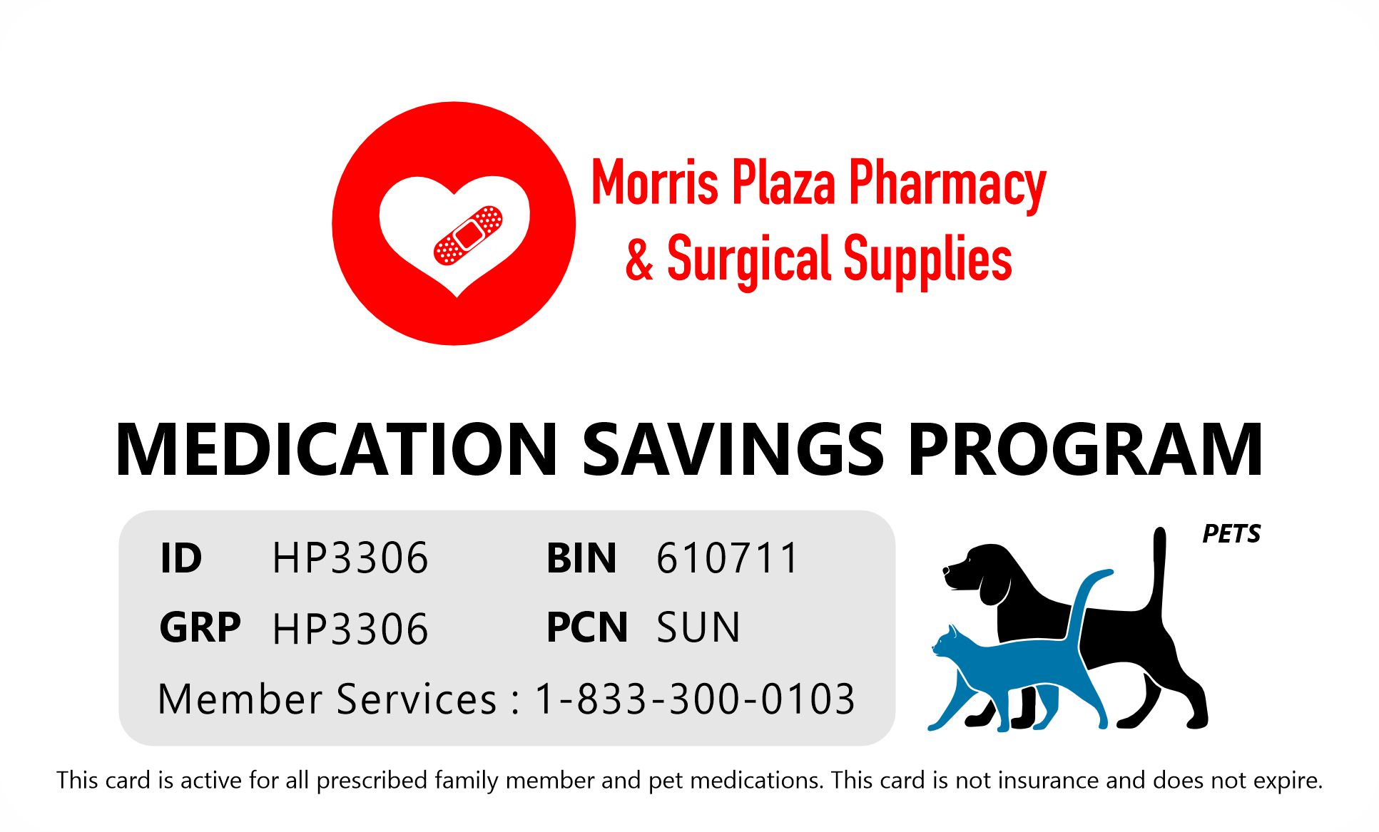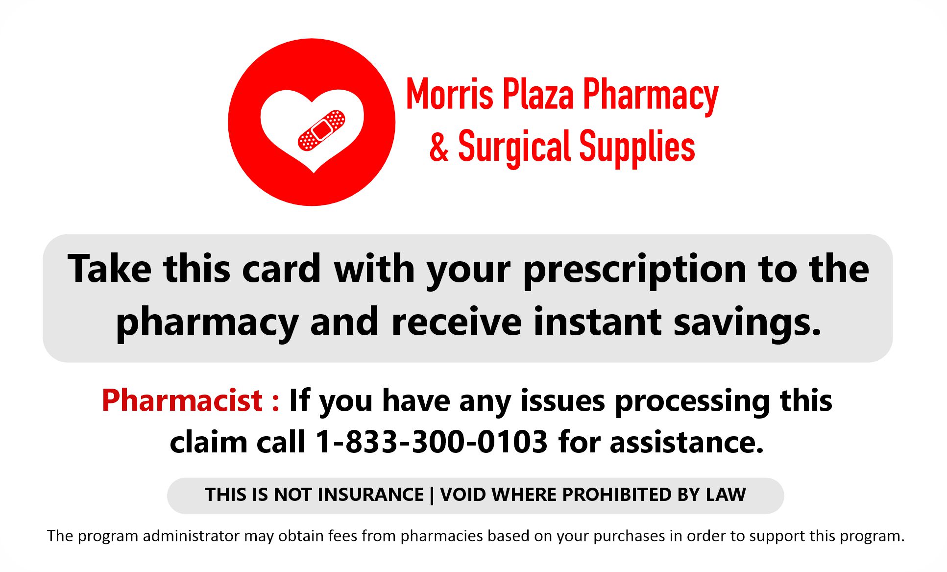 The Morris Plaza Pharmacy medication savings program provides discounts of up to 87% off retail prices at all major chains and most independent pharmacies nationwide.